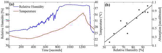The laboratory proof of the concept detailed in the main text, in which the NIR cameras measured the path-integrated H2O concentration above a beaker of liquid as it was heated up, where (a) shows the change in temperature and humidity values through time and (b) the camera-derived absorbance is plotted against relative humidity, revealing a linear relationship between these parameters through the heating process.