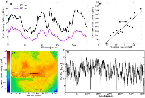 Relating to the field campaign on Vulcano island: (a) an example of pixel intensities from each camera in a horizontal line above the fumarole field degassing, illustrating the greater signal attenuation at 940 nm due to more H2O absorption than in the 850 nm channel; (b) a system calibration plot of Multi-GAS derived column amounts vs. camera absorbance data points, required to generate calibrated plume imagery; a calibrated image showing slant column densities and ICA line used for (a), is displayed in (c); and in (d) an example flux time series for a one hour acquisition period is shown. See main text for further details.