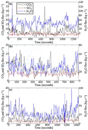 First report of contemporaneous 1 Hz volcanic CO2, SO2, and H2O flux time series; data shown in (a–c) pertain to our observations on the North East Crater for periods: NEC1, NEC2, and NEC3 respectively. At ≈650 s in (a) there is a large spike in CO2 emission, not evident in the other gases’ time series.