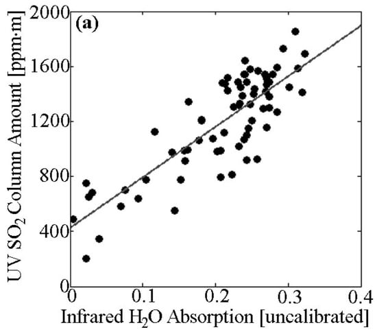 On the basis of these observations, we present the first contemporaneous record of 1 Hz H2O, CO2 and SO2 gas flux time series from a volcano, in Figure 3a–c. These three multiple gas species time series are referred to as NEC1, NEC2, and NEC3, respectively. Whilst one would not expect an absolute correlation in the emissions of these three species, e.g., a temporal osillation in released CO2/SO2 ratios from Mt. Etna has already been demonstrated [33], there is a degree of correspondence between the manifested peaks and troughs in the species’ flux trends. This point is also demonstrated in Figure 4, which shows the SO2 column amounts averaged over a 10 × 10-pixel section of the UV images, and plotted against the averaged uncalibrated H2O absorbance in the same field of view, for a series of contemporaneously captured images. In this case, a general relationship is manifested, with scattering about the trend line. One clear deviation from this broad agreement is a pulse in CO2 degassing at ≈650 s in Figure 3a, which is not manifested in the H2O dataset, and only marginally in the SO2 degassing. This mirrors the pulses in CO2 outgassing, which is not shared in the SO2 emission dataset, but was noted in an earlier inter-comparison of high time resolution volcanic fluxes of these two gas species [33].
