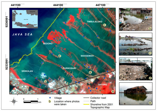 (a) The study area is located in the north of Java, Indonesia displayed using the RGB 542 of Landsat image. Some examples of coastal inundation impact: (b) daily flooded-houses; (c) an abandoned and flooded-paddy field; (d) coastal land embankment; and (e) permanent-inundated houses.