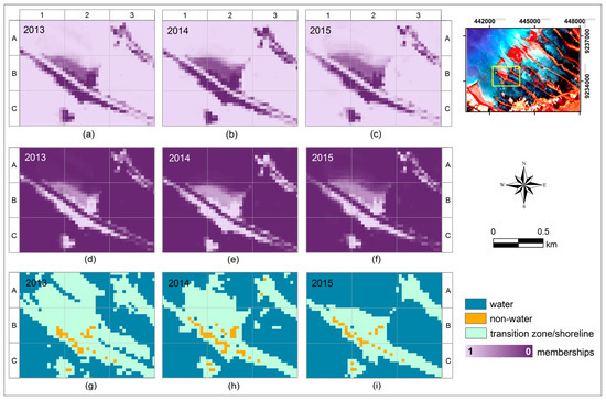 The results of FCM classification are presented in Figure 3 with the values ranging from 0 to 1 for both membership images of water (Figure 3a–c) and non-water (Figure 3d–f). Areas with higher water membership values were located for example in marine areas, fishponds, and water-covered agricultural areas (Figure 3a, e.g., grid cell A2). In Figure 3d, higher non-water membership pixels are located near settlements adjacent to the shorelines, and mangrove forests (Figure 3d, e.g., grid cells B2 and C3).