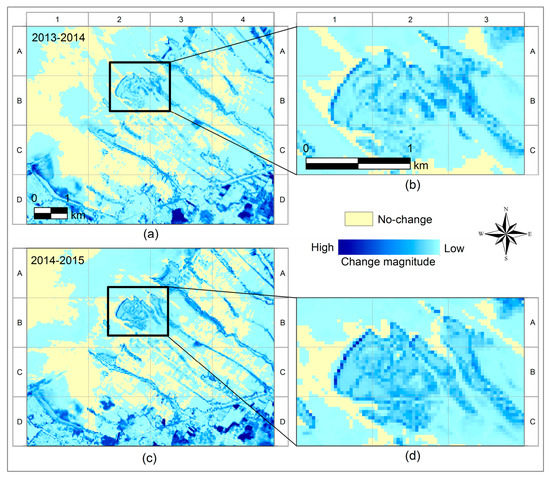 The magnitude of shoreline change during: 2013–2014 (a,b); and 2014–2015 (c,d). The magnitude values vary from high magnitude represented by dark blue pixels up to low magnitude represented by light blue pixels, whereas light yellow pixels show the no-change areas.