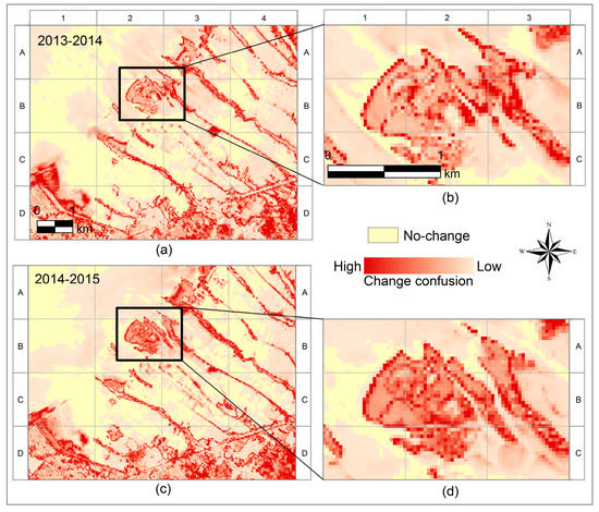 The intensity of the change confusion was identified for each change direction category in the period 2013–2014 and in the period 2014–2015, respectively (Figure 8a,c). Three change confusion values were identified including positive direction, negative direction and unclear direction.
