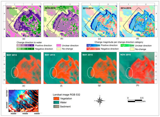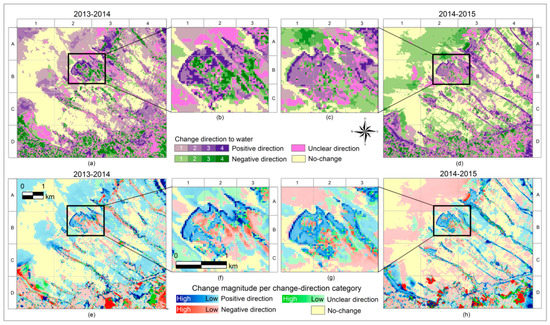 The representation of shoreline change direction: in the period 2013–2014 (a,b); and in the period 2014–2015 (c,d). Darker color pixels show a higher frequency of change to a certain direction. Shades of violet pixels depict a positive direction to water membership while shades of green pixels illustrate a negative direction to water membership. Figures in the second row show the magnitude of each change direction category in the period 2013–2014 (e,f); and in the period 2014–2015 (g,h). Darker color pixels represent a higher change magnitude while lighter color pixels show a lower change magnitude.