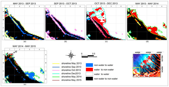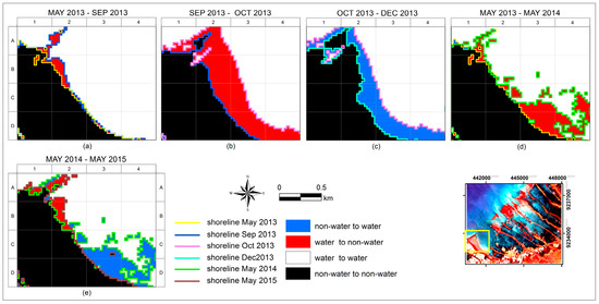 Figure 9 and Figure 10 show the change detection of shoreline using post classification comparison of MLC and hardened classification, respectively. Both MLC and hardened classification present shoreline as a single line. The changes of this single shoreline have occurred due to the changes of water and non-water area. Binary images from two dates and were superimposed in GIS and four types of change were identified, namely: non-water to water, water to non-water, water to water and non-water to non-water. Figure 9a–c and Figure 10a–c show the changes of shoreline in three consecutive dates in 2013, whereas Figure 9d,e and Figure 10d,e present two examples of shoreline changes from 2013 to 2014 (Figure 9d and Figure 10d) and from 2014 to 2015 (Figure 9e and Figure 10e).