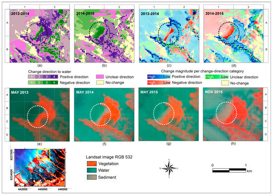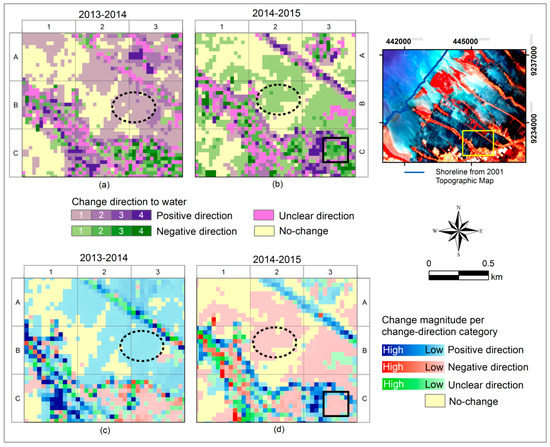 Water membership changes show a low change direction to positive direction in the period 2013-2014 (a); and to negative direction in the period 2014-2015 (b). The change magnitude values were low in both periods (c,d). This type of change was also observed as small patches of the coastal land (see black rectangle sites in (b,d)).