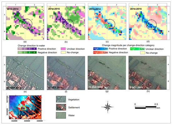 The change areas for each category are presented in Table 5. A positive direction to water covers an area of approximately 1828 ha in the period 2013–2014 and 1120 ha in the period 2014–2015. A negative direction has occurred for 920 ha and 1635 ha in the period 2013–2014 and in the period 2014–2015, respectively. Unclear direction category presented as pink pixels can be seen in Figure 7c, e.g., grid cells A2 and C1 covering an area of 616 and 528 ha in 2013–2014 and in 2014–2015, respectively. No-change direction shows a stable area which is mostly located at the sea or inundated fishponds represented by light yellow color (see Figure 7a,d, e.g., grid cells A1 and B1) covering an area of 1319 and 1403 ha in the period 2013–2014 and in the period 2014–2015, respectively.