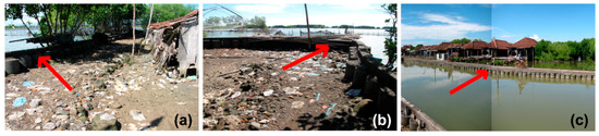 Extensive fishponds and rice fields are covering the study area. Settlements are found bordering the sea and along the riverbanks, which are threatened if tidal floods become higher. This area has suffered from a changing shoreline position leading to severe coastal inundation and erosion. The coastal inundation has increased recently both in terms of frequency and duration. Some factors such as extreme winds and waves contribute to this increase. Furthermore, in the long run, other causes such as land subsidence, sea level rise, mangrove conversion, beach reclamation and a seaport extension are potential causes for increased coastal inundation [38,40,41,42].