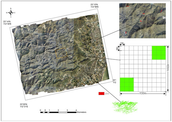 The study zone is in the center of Dinghushan National Nature Reserve, which is situated in Zhaoqing, Guangdong Province, China. It is located in E, N and covers a total area of 1155 ha with the altitude (height above mean sea level) of 14.1–1000.3 m. This area is mainly covered by a low subtropical evergreen broad-leaved forest more than 400 years old and a coniferous and broadleaf mixed forest as well as montane evergreen shrubs and bushes. The trees under investigation in the site belong to the following species: pinus massoniana, schima superba, castanopsis chinensis, gironniera subaequalis, and eucalyptus robusta, etc.