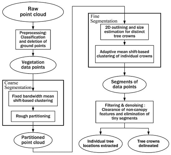 In the past two decades, efforts have been made to decrease forest inventory costs by using data obtained from remote sensing technology. Airborne LiDAR (Light Detection And Ranging) is an active remote sensing technology that provides distance measurements between an aircraft (or any other platform) and the surface illuminated by the laser beam [1,2]. Due to its ability to generate 3D (three-dimensional) data with high spatial resolution and accuracy, the airborne small-footprint LiDAR is becoming a promising technique for modeling the forest canopies and thus for completing several inventory tasks [3,4]. Numerous methods or algorithms have been proposed to identify or detect individual trees or tree crowns using airborne LiDAR data. Raster-based approaches utilizing the canopy height model (CHM) derived from raw LiDAR data are widely adopted for individual tree segmentation [5]. In a typical CHM-based scenario, a local maximum filter is used to detect treetops and then the individual tree crowns are delineated with a marker-controlled watershed segmentation scheme or a pouring algorithm [6,7,8,9,10]. Region growing, as a category of simple region-based segmentation methods, can be adopted for segmentation of 3D point cloud generated by the LiDAR [11] and it is the most common approach to segmenting trees in original LiDAR data [1,3,12]. Extracting individual trees directly from the original LiDAR data can also resort to clustering-based methods. One of the most popular clustering methods is the k-means algorithm, which aims to partition n observations into k clusters where each observation belongs to the cluster with the nearest mean by trying to minimize the overall sum of Euclidean distances of the points in feature space to their cluster centroids [13,14,15]. Most of these methods fall into one of the two categories: raster-based approaches or point-based approaches. Usually, raster-based approaches are more automatic and require fewer parameters than point-based approaches and thus have a leading edge in processing speed, but they tend to merge crowns in dense stands of deciduous trees or fail to detect understory trees in a multi-layered forest as the process of producing a CHM could lead to loss of information from different levels in the canopy [9]. Alternatively, point-based approaches work directly on the original airborne laser scanning (ALS) data (namely the “point cloud”, a discrete set of point locations) rather than rasterized images. This category of methods is preferable because it provides a promising way of producing relatively high accuracy by detecting smaller trees in the understory than CHM-based methods.