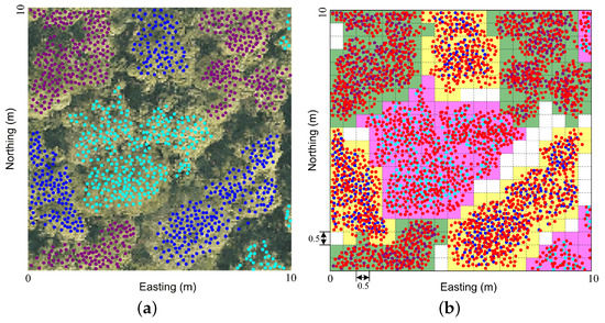 An example of the rough partitioning for a portion of a typical subplot (DHS0101). This is a downward-looking view of the area. (a) Fixed bandwidth mean shift clustering results overlaid onto a digital orthophoto map (DOM). Spatially adjacent clusters are rendered in different colors. (b) Rough partitioning of the forest area based on the small square grouping technique. Connected squares marked in the same color belong to the same partition.