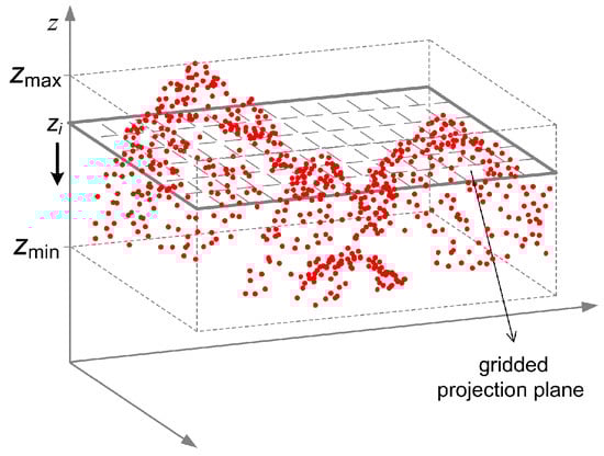 Firstly, rough boundaries of all distinct tree crowns in a partition are outlined by a simple region growing method based on incremental grid projection that we put forward particularly for this study. As shown in Figure 4, suppose there is a plane (or screen) horizontally suspended over a partition of the forest area under study, project all the first pulse data points downward onto the plane and the 3D spatial distributions of the tree crowns will be reduced to 2D horizontal features on the plane. The projected 2D clusters on the horizontal plane represent the distribution of tree crowns at a certain height level and they will increase as the horizontal plane moves from top to bottom. The elevation value (z coordinate) of the horizontal gridded plane decreases in a uniformly discrete mode, which implies shifting the projection plane at equal spacing from top to bottom. All of the points above the height-variable plane in the first return data set are projected downward onto this plane. It is possible to get the 2D horizontal distribution of individual tree crowns at different height levels when more than one 2D horizontal projections are available. Define and as the minimal and maximal coordinate values respectively in the z-axis of the axis-aligned minimum bounding box for the data set, and I as the total number of shift layers (each layer corresponds to an iteration of the region growing process), and then the elevation value for the projection plane used in the i-th shift can be determined as