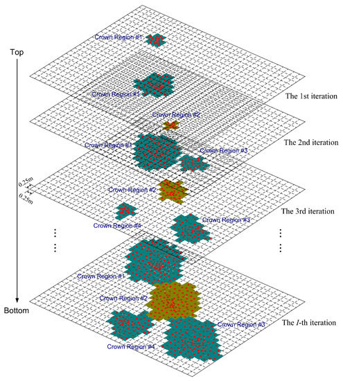 In order to simplify further analyses, the plane is divided into small grids by a raster net and points within the partition are mapped into grid cells, which can be regarded as pixels of an image. A non-empty cell (containing one or more projected points) is marked as a set pixel while an empty cell corresponds to an unset pixel. Thus, a series of 2D horizontal binary images can be generated. The clusters on the horizontal projection image at each layer represent the distribution of tree crowns in the correspondent height level. Therefore, a distinct tree crown should be visible at the same location of several vertical neighboring layers. The basic concept of the simple region growing method is to trace the presence of crown outlines on the binary images from top to bottom through projection images at different height levels. Outlines of the crown at the upper layers will present a cluster feature on the projection image, thus the task of detecting a distinct tree crown turns to an issue of extracting cluster feature of the treetop and tracing the crown outline from top to bottom. Figure 5 depicts an example of such a region growing process, whose aim is to obtain an approximate intercepting area in terms of grid cell numbers for each distinct tree crown. The axis-aligned 2D horizontal plane is divided into grid cells with identical size of 0.25 m × 0.25 m. In each iteration, points no lower than the elevation of the moving projection plane are vertically mapped to their corresponding grid cells, and each non-empty cell might be determined as a new seed, if the distance from the existing clusters exceeds the threshold value of , or else it would be added into an existing group based on spatial adjacency using a morphological analysis. The last iteration completes the region growing process and the area enclosed by the outmost grid cells in a region will be considered as the estimate of the intercepting area for a particular tree crown. Let be the number of grid cells contained in a grown region, and the approximate intercepting area for the corresponding tree crown will be , whose unit is m. Thus, the effective crown diameter for a particular tree can be estimated as