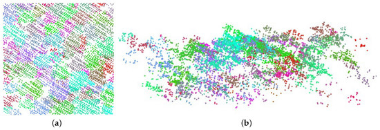 An example of the ultimate clustering results for the point cloud in the test subplot of DHS0201. (a) Top view. (b) Side view.