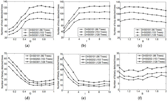 The proposed scheme requires proper values for the kernel radius h of the adaptive mean shift algorithm and the control parameters of the coarse segmentation and rough estimation. Theoretically, the value of Q (a positive number of less than 1) will influence the coarse segmentation, the values of I (a positive integer greater than 1) and B (a real number of greater than 1 and less than 2) will influence the adaptive calibration of the kernel bandwidth, and in turn they will influence the ultimate performance of this method. We demonstrate the performance of tree detection with these control parameters of the method. The results of sensitivity analysis, including both the numbers of truly detected trees, which are related to omission errors, and the falsely detected tree numbers reflecting commission errors, from the variations of the three parameters are shown in Figure 7.