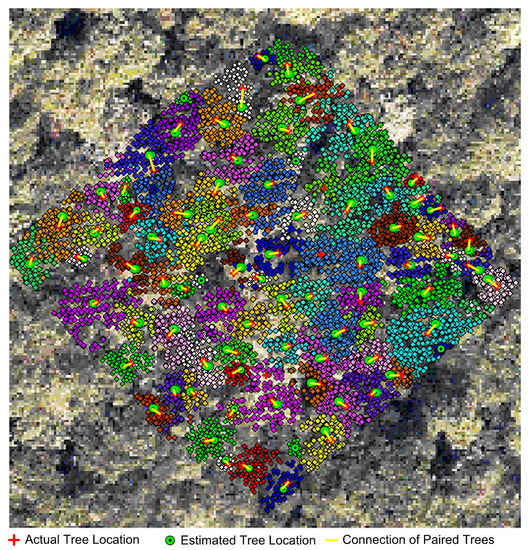 Experiments are conducted over all trees in 10 sample plots (or 20 test subplots) to validate and evaluate the performance of our proposed adaptive mean shift-based approach for identification and delineation of individual tree crowns. The performance will be evaluated by means of both qualitative analysis and quantitative calculations. The approximate positions of individual trees acquired through these mathematical procedures are overlaid onto a digital orthophoto map (DOM) with known tree locations of a typical measurement area (Subplot ID: DHS0401) to see if the detected tree locations coincide with the regions of actual trees. The information about actual tree locations comes from the reference data collected through field measurements conducted in the specific area. The approximate tree positions are estimated by finding each cluster’s stationary points via gradient ascent, which represent modes of the underlying density function. The reference trees (or field measured trees) and the estimated trees (or LiDAR determined trees) are paired by assigning each reference tree with the closest cluster, using both distance and tree height as matching criteria. A cluster is linked with a reference tree provided that (i) the distance to the reference tree is smaller than 60% of the mean tree distance within the subplot; and (ii) the difference between the derived tree height and the height of the reference tree is smaller than 15% of the top height of the subplot. A LiDAR tree can be matched with more than one reference tree, compensating the effect of “tree clusters”, with a dominant overstory tree being surrounded by smaller suppressed trees. The results of this matching can be seen in Figure 8. Figure 9 shows matching outcome in other two test subplots. These figures indicate that the spatial fitness between the point clusters and reference trees is fairly good. However, if the mutual distance between two adjacent point clusters is less than the threshold, which is the estimated value of local crown diameter, the two clusters cannot be distinguished and will be identified as a single cluster.