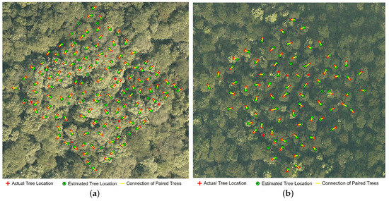 Matching of the reference tree positions and the estimated positions for two different test subplots. (a) A dense single-tree species dominated subplot (DHS0602). (b) A sparse multi-tree species dominated subplot (DHS0702).