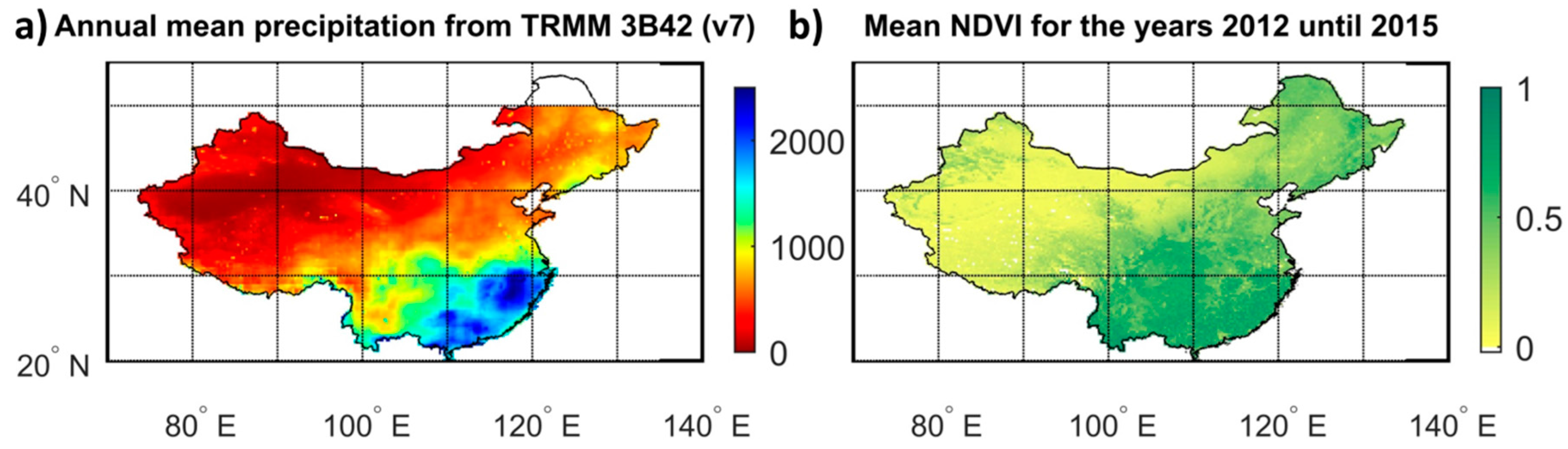 Additional datasets used in this study that were provided as supporting information for interpretation purposes include (a) the annual mean TRMM 3B42 (v.7) precipitation product (mm); and (b) NDVI data [-] over the mainland of the People’s Republic of China.