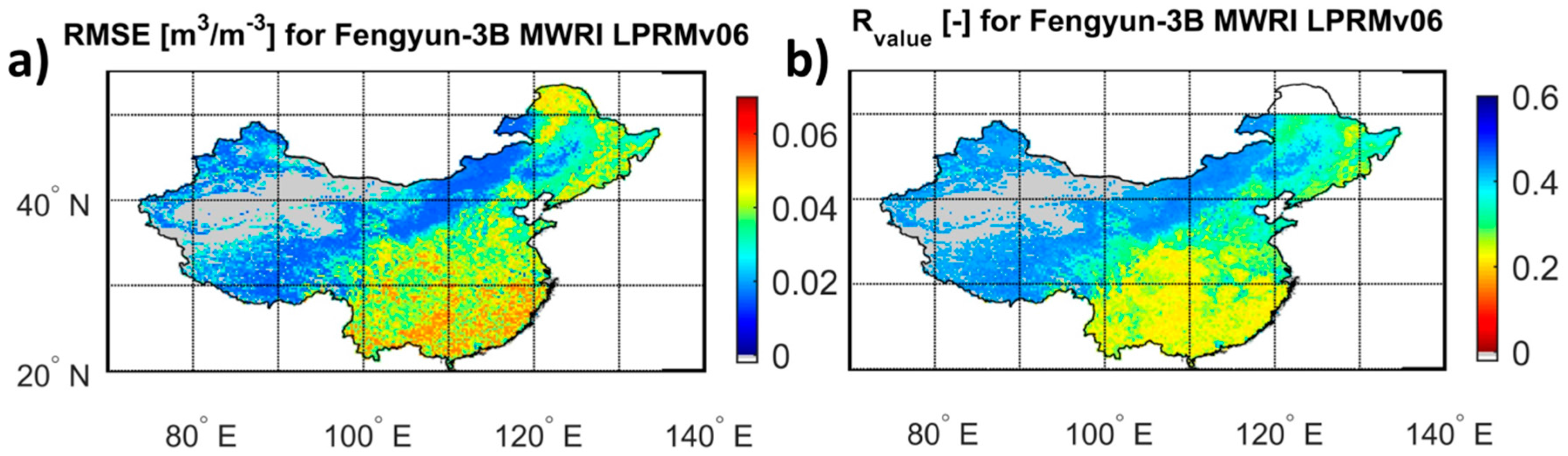 - Parinussa, R.; Wang, G.; Holmes, T.; Liu, Y.; Dolman, A.; de Jeu, R.; Jiang, T.; Zhang, P.; Shi, J. Global surface soil moisture from the microwave radiation imager onboard the Fengyun-3B satellite. Int. J. Remote Sens. 2014, 35, 7007–7029. [Google Scholar] [CrossRef]