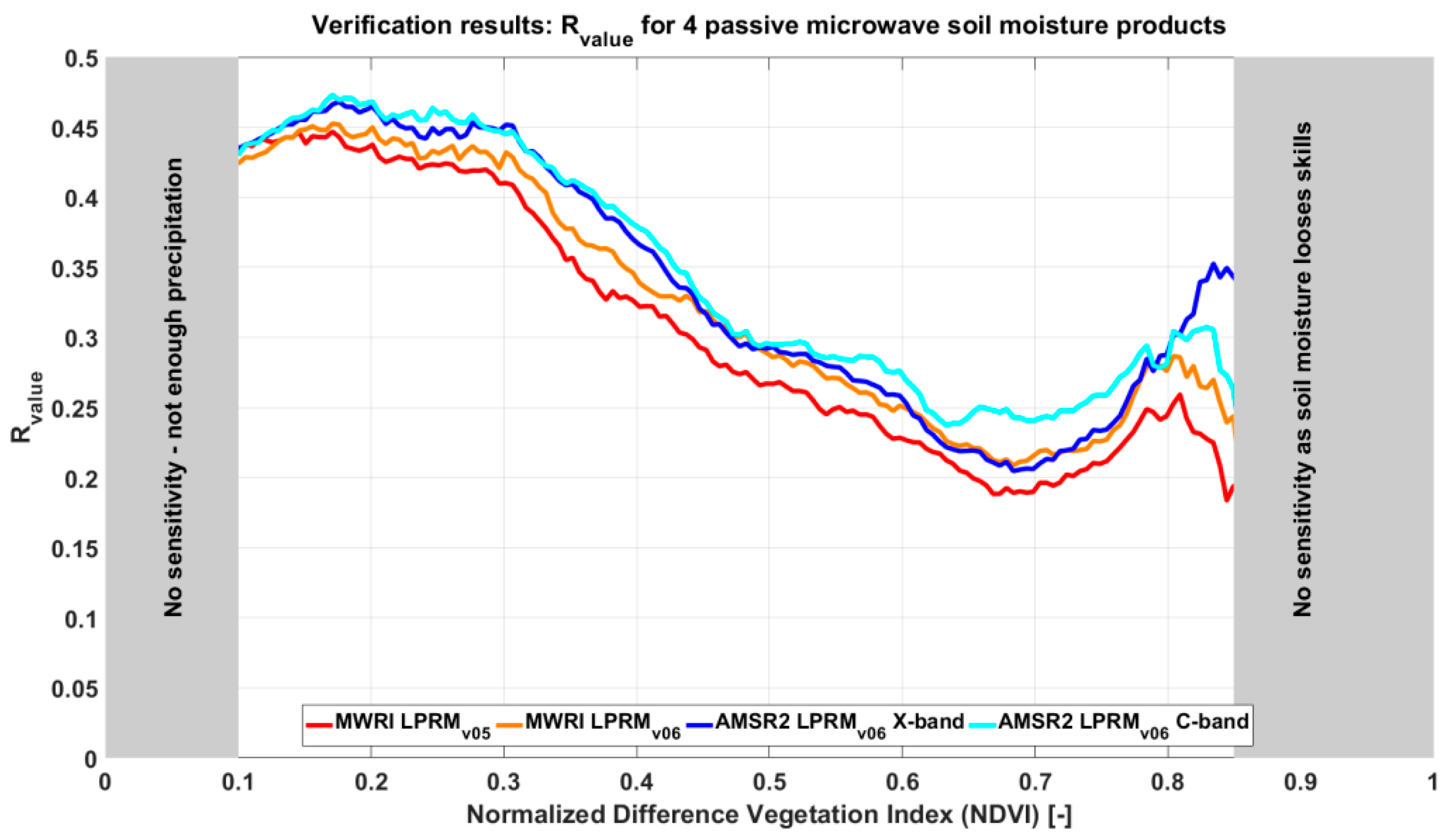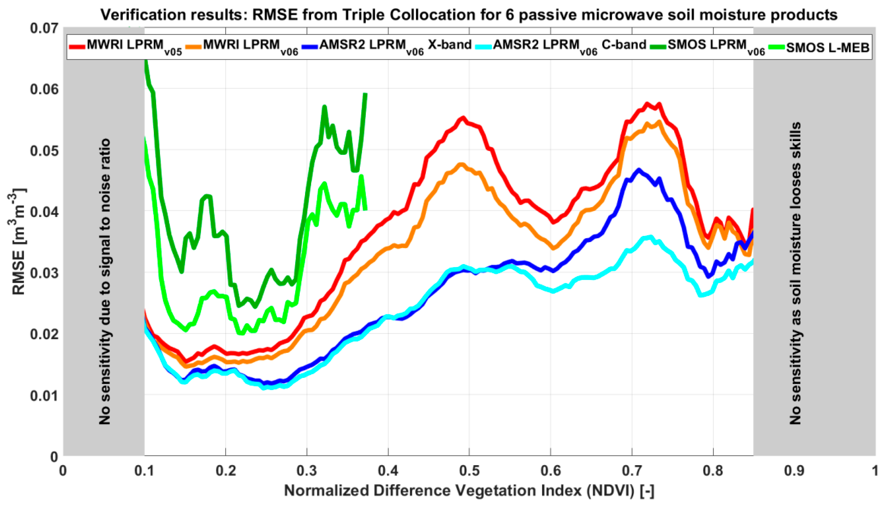 In the next step (product comparison B), the Triple Collocation results from the MWRI-LPRMv06 (▬) were compared against AMSR2-LPRMv06 (▬). For NDVI values at the lower end of the vegetation range (NDVI < 0.45), results obtained by both techniques are clear and consistent with each other. Within this NDVI range, the Triple Collocation technique indicates consistently lower RMSE for AMSR2-LPRMv06 compared to MWRI-LPRMv06. This result is confirmed by the higher numbers obtained through the Rvalue technique within this lower end of the vegetation range. The only diverging result between the two verification techniques found in this study was demonstrated for the comparison when NDVI values exceed 0.45. While Triple Collocation consistently demonstrates better performance for AMSR2-LPRMv06 (▬), the Rvalue indicates a relatively similar performance between AMSR2-LPRMv06 (▬) and MWRI-LPRMv06 (▬) above this threshold. While the exact reason for this discrepancy remains unknown, several reasons might have an impact. The generally better performance of AMSR2-LPRMv06 (▬) against MWRI-LPRMv06 (▬) is an interesting finding and somewhat unexpected when satellite and sensor characteristics are taken into consideration, as frequency, bandwidth and sensor accuracy are relatively similar. Nonetheless, several other factors can play a role as the LPRMv06 algorithm update [22] was solely developed for AMSR-E observations, which better match AMSR2 than MWRI characteristics. Even though these different sensor characteristics are only slightly different, they can potentially penalize MWRI when directly compared to AMSR2. Besides this single discrepancy, further agreement between the remaining findings is striking.