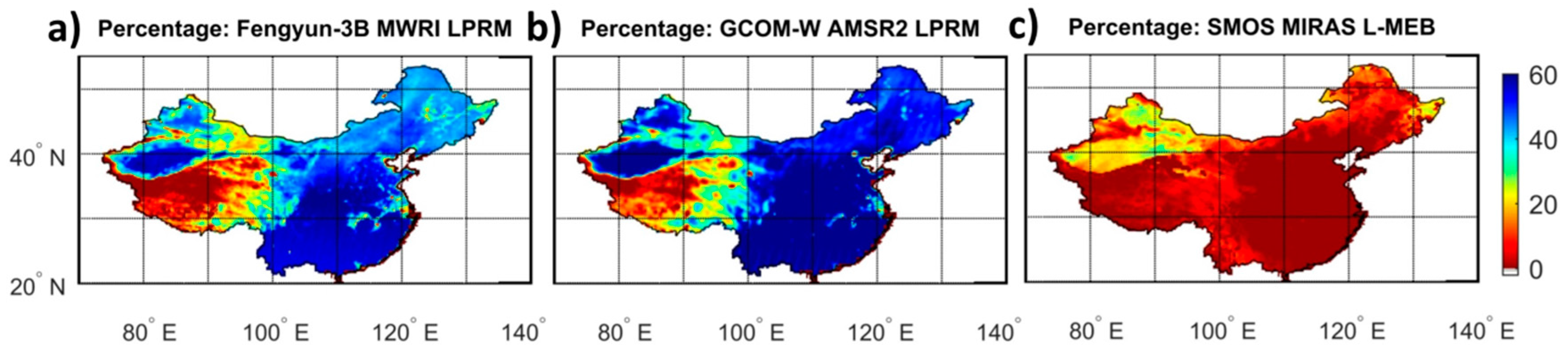 The percentage of days in which microwave sensors can be converted to surface soil moisture over the entire analysis period (2012–2015) for the three passive microwave sensors considered in this study: MWRI (a), AMSR2 (b) and SMOS (c).