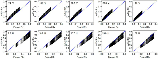 Frequency and polarization characteristics of surface roughness effects on the effective surface reflectivity from the advanced integral equation model (AIEM) simulated data at an incident angle of 55°. The first row gives the AIEM simulated effective surface reflectivity versus the corresponding Fresnel reflectivity for vertical (V) polarization, whereas the second row does the same, but for horizontal (H) polarization (Rv: reflectivity for vertical polarization; Rh: reflectivity for horizontal polarization).