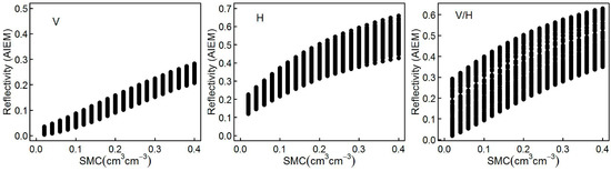 The effective surface reflectivity from the AIEM simulated data versus soil moisture content (SMC) at a frequency 10.7 GHz and an incident angle 55° for vertical (V) polarization, horizontal (H) polarization, and the ratio of two polarizations (V/H).