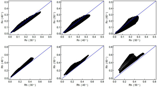 The incident angle dependence of the effective surface reflectivity from the AIEM simulated data. The two rows are for vertical and horizontally polarization, respectively (Rv: reflectivity for vertical polarization; Rh: reflectivity for horizontal polarization).