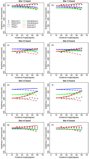 Ground-based measurements from the four sites with different surface conditions were used to evaluate the parameterized soil surface emissivity model. The parameters of the rough soil surfaces measured at the four sites are listed in Table 3. Figure 5 shows the comparisons between the measured brightness temperatures and the brightness temperatures calculated by the Weng, Chen and Weng, and the parameterized soil surface emissivity models. The calculated brightness temperatures at different incident angles and frequencies can be obtained as the product of surface emissivity and physical temperature [17,28]. In comparison with the measurements, there are consistent negative errors from the Weng model both for V-pol and H-pol at sites 1 and 4 and distinct positive errors at site 3, particularly for low incident angles. For the Chen and Weng model, the errors appear to be similar for sites 1 and 4, whereas the errors are smaller than those of the Weng model at sites 2 and 3. The errors show similar characteristics for bands C and X at all sites. In addition, the differences between V-pol and H-pol estimated by the Chen and Weng model nearly disappear at high incident angles for sites 1, 2, and 4. For all sites, the improved parameterized soil surface emissivity model agrees well with the measurements, although an error still exists for H-pol at high incident angles.