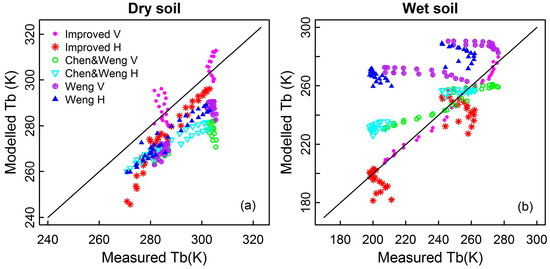 Simulated brightness temperatures (Tb: brightness temperature in K) compared with the ground-based measurements for (a) dry soil and (b) wet soil using the Weng, Chen and Weng, and parameterized soil-surface emissivity models for vertical (V) polarization and horizontal (H) polarization. The input parameters of soil conditions are listed in Table 3.