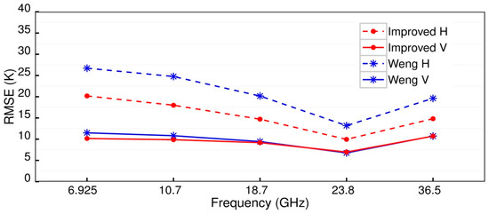 The simulations of satellite measurements were conducted based on the CRTM in which the soil surface reflectivity was estimated by the Weng model. A two-stream radiative transfer approximation was used to calculate the volumetric scattering from different types of surfaces, such as snow, desert, and vegetation [1]. The simulations also consider the AMSR-E scan pattern, such as the scan angle and the orbit’s swath width. The microwave brightness temperatures, estimated by the parameterized soil surface emissivity model, were also compared. Figure 8 shows the RMSEs between the observed and the simulated brightness temperatures. The RMSEs from the Weng model are all above 10 K in V-pol and above 20 K in H-pol, except for the frequency 23.8 GHz. In contrast, an overall improvement from the parameterized soil surface emissivity model can be found in both polarizations for the five frequencies, although the RMSEs reduce slightly in V-pol. The improvement is more obvious in the lower frequencies, particularly in H-pol. Table 6 gives the distribution statistics of the simulated brightness temperature errors against the satellite measurements between −10 and 10 K. The results show that the percentages of errors from the Weng model between −10 and 10 K are all greater than 64% in V-pol and less than 60% in H-pol for the five frequencies. The results also indicate that the proportion of high errors using the Weng model is larger in H-pol. The percentage of errors between −10 and 10 K worked out by the parameterized soil surface emissivity model increased significantly in H-pol and slightly in V-pol. Overall, the simulation accuracy has been improved more for H-pol than for V-pol, particularly for the low microwave frequencies.