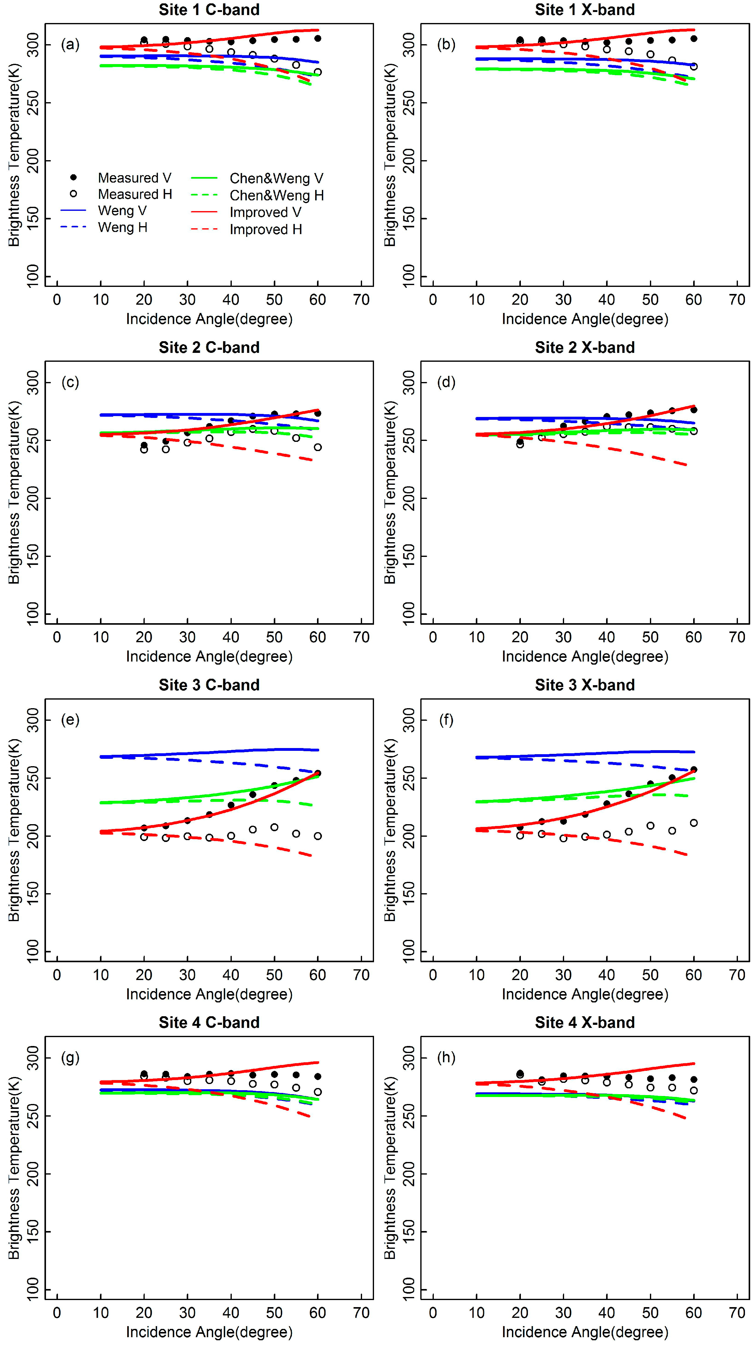 Ground-based measurements from the four sites with different surface conditions were used to evaluate the parameterized soil surface emissivity model. The parameters of the rough soil surfaces measured at the four sites are listed in Table 3. Figure 5 shows the comparisons between the measured brightness temperatures and the brightness temperatures calculated by the Weng, Chen and Weng, and the parameterized soil surface emissivity models. The calculated brightness temperatures at different incident angles and frequencies can be obtained as the product of surface emissivity and physical temperature [17,28]. In comparison with the measurements, there are consistent negative errors from the Weng model both for V-pol and H-pol at sites 1 and 4 and distinct positive errors at site 3, particularly for low incident angles. For the Chen and Weng model, the errors appear to be similar for sites 1 and 4, whereas the errors are smaller than those of the Weng model at sites 2 and 3. The errors show similar characteristics for bands C and X at all sites. In addition, the differences between V-pol and H-pol estimated by the Chen and Weng model nearly disappear at high incident angles for sites 1, 2, and 4. For all sites, the improved parameterized soil surface emissivity model agrees well with the measurements, although an error still exists for H-pol at high incident angles.