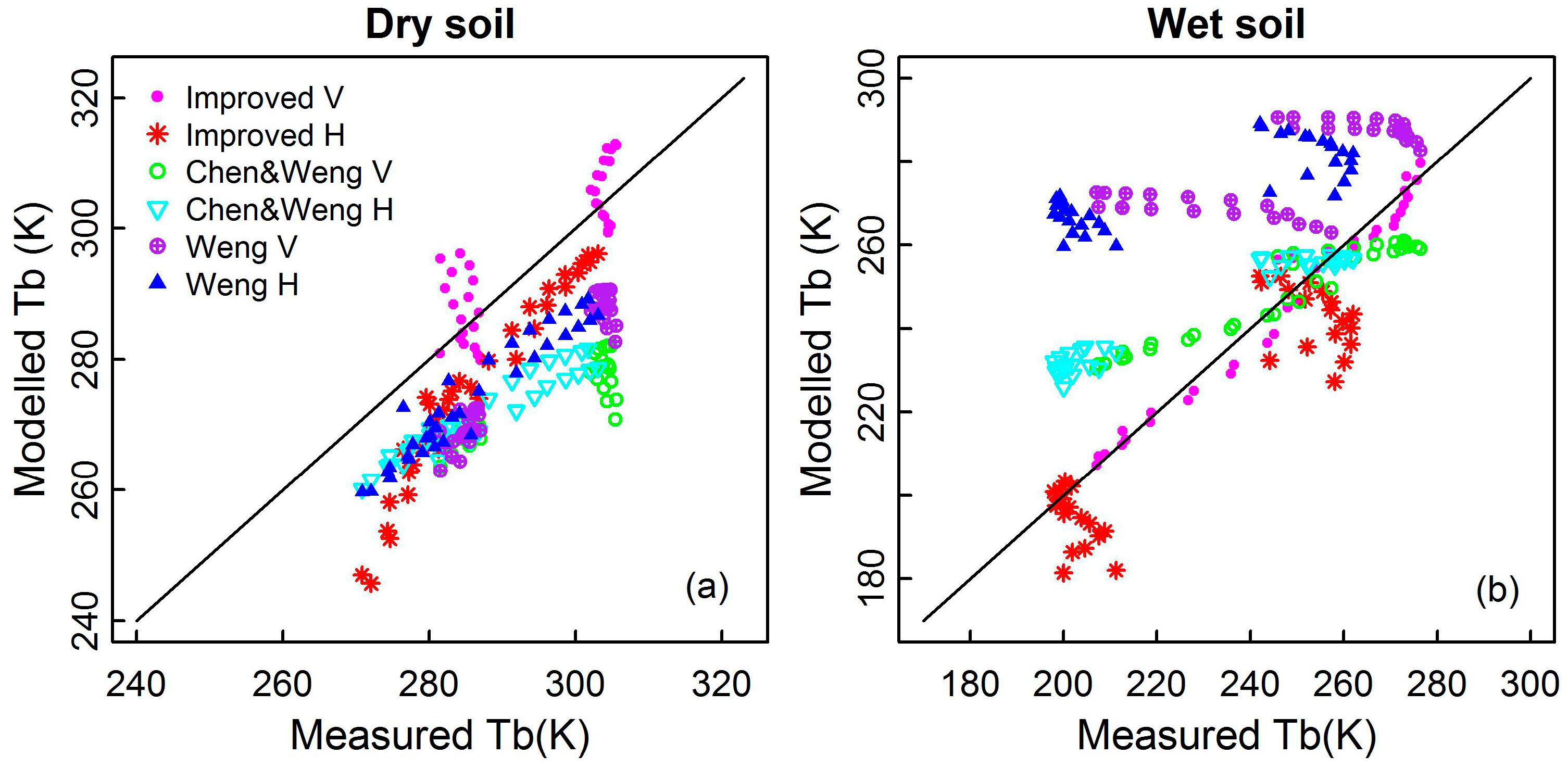 Simulated brightness temperatures (Tb: brightness temperature in K) compared with the ground-based measurements for (a) dry soil and (b) wet soil using the Weng, Chen and Weng, and parameterized soil-surface emissivity models for vertical (V) polarization and horizontal (H) polarization. The input parameters of soil conditions are listed in Table 3.
