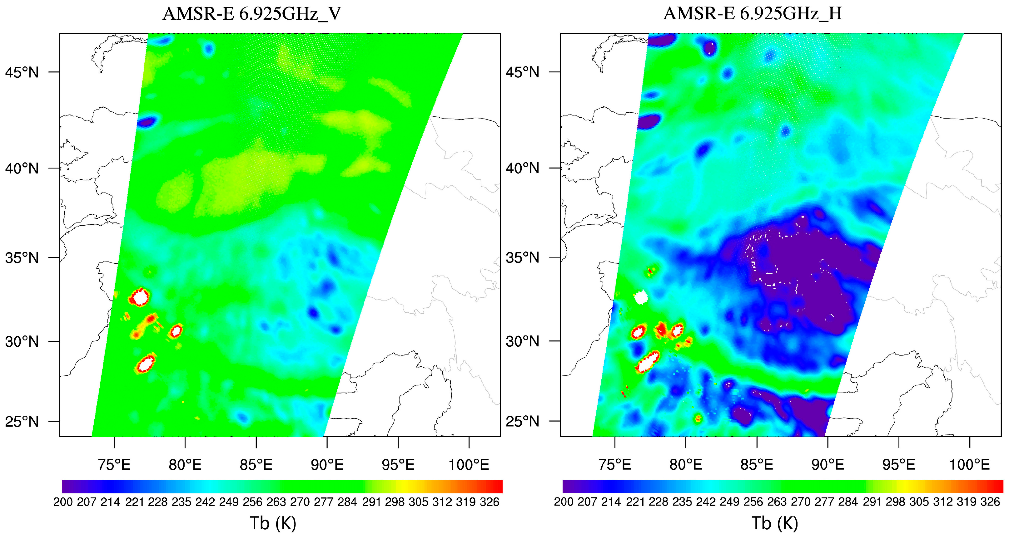 Advanced Microwave Scanning Radiometer-Earth Observing System (AMSR-E) coverages for brightness temperatures (Tb in K) at a frequency 6.925 GHz used for simulation and comparison between vertical (V) polarization and horizontal (H) polarization.