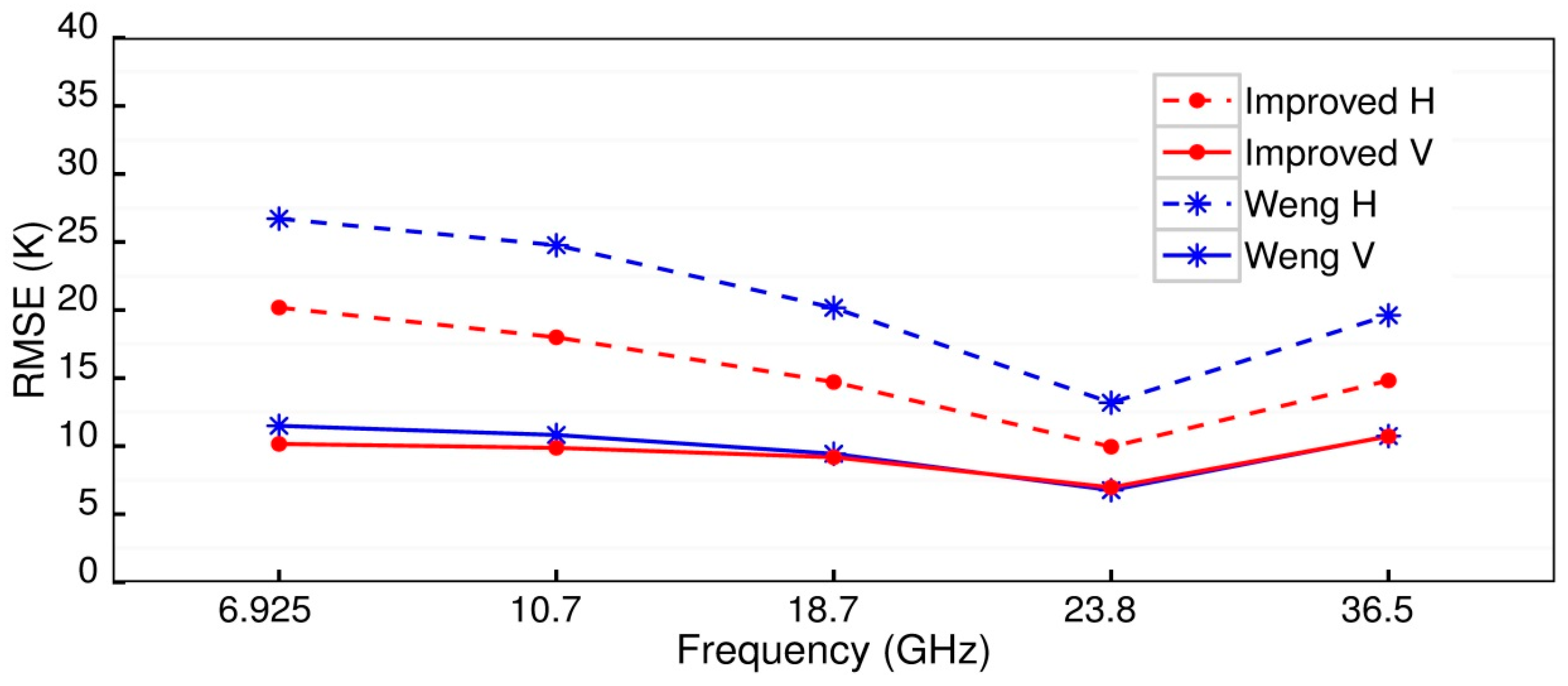 Comparison of the RMSEs between the observed and simulated brightness temperatures (in K) using the Weng and the parameterized soil surface emissivity models for vertical (V) polarization and horizontal (H) polarization.