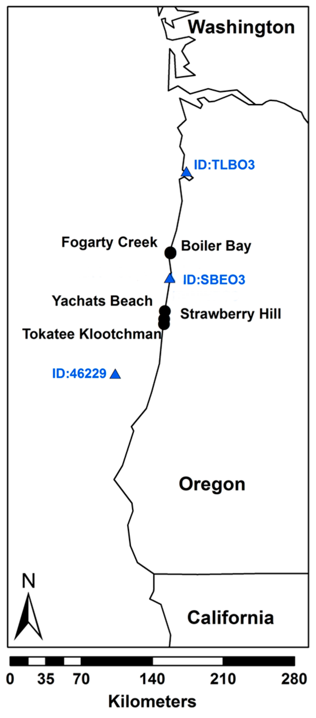 A map of the temperature collection locations and study sites along the Oregon coastline.