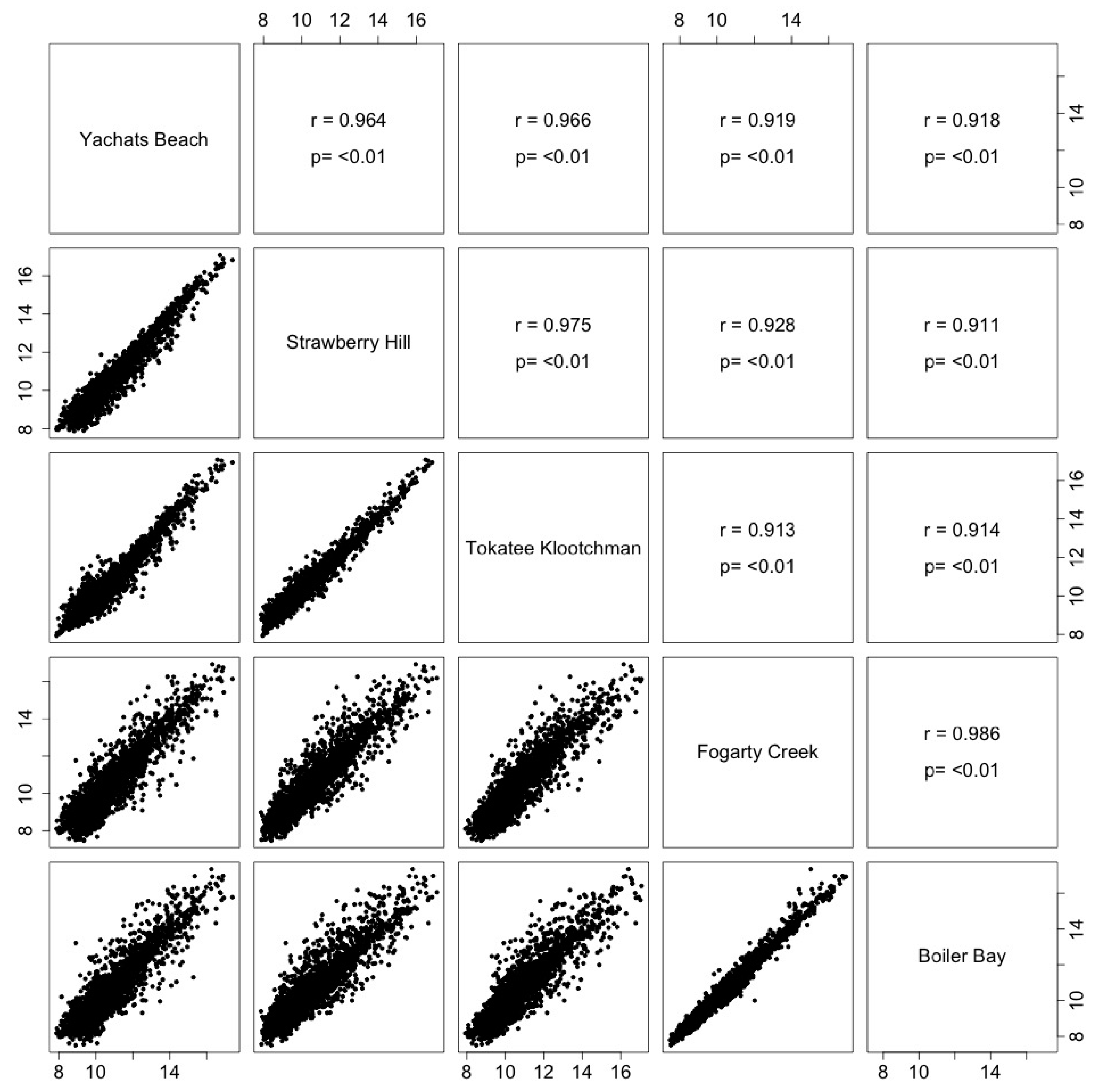 Correlation matrix with scatterplots showing the relationship between submerged mussel logger temperature and the water temperature estimate at the Yachats Beach study site. The scatterplots are shown in the lower left portion of the figure. The Pearson r correlation coefficients and r-squared values are shown in the upper right portion of the figure.