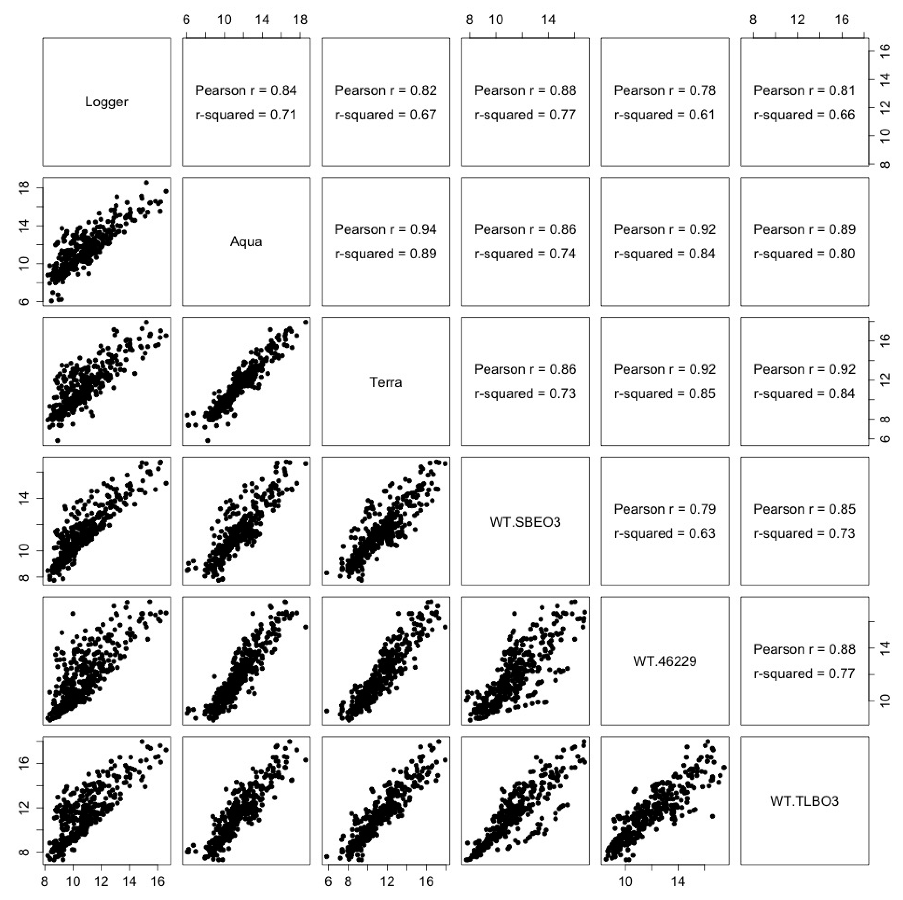 We conducted statistical analyses on the data using several R packages [26]. All hourly data was averaged to daily observations for analysis. To understand the temporal and spatial variation of the data, identify any anomalies in the datasets, and to determine if the data met the assumptions of the statistical tests, we used univariate descriptive statistics, such as mean, variance, standard deviation, boxplots, and frequency distributions. To better understand the relationship between the different datasets and whether distance, type of temperature collection, or the time of temperature collection (month or season) had an impact on prediction of logger temperature, we conducted different bivariate statistical tests.