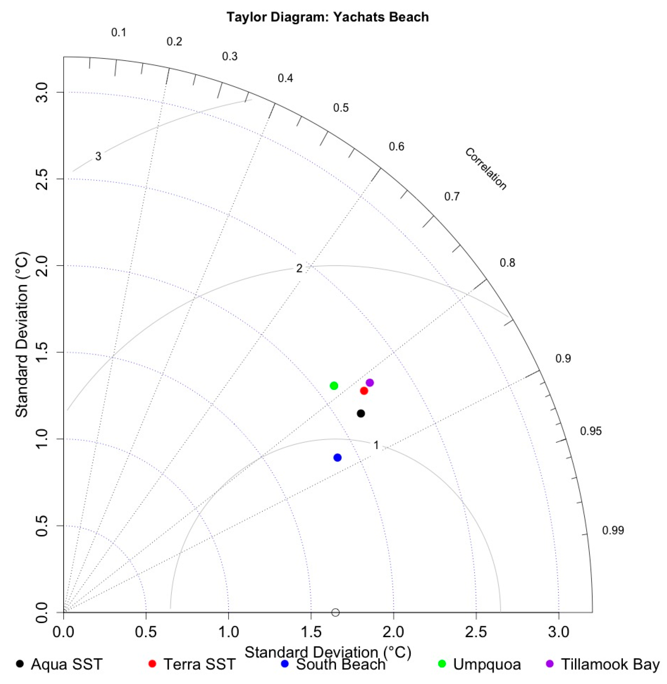 Taylor diagram for Yachats Beach where each water temperature estimate (Aqua SST, Terra SST, South Beach water temperature, Umpquoa Offshore water temperature, and Tillamook Bay water temperature) was used to predict daily submerged mussel logger temperature. South Beach water temperature was the best predictor of daily submerged mussel logger temperature when compared to the other water temperature estimates. The second-best predictor for logger temperature at Yachats Beach was Aqua SST.