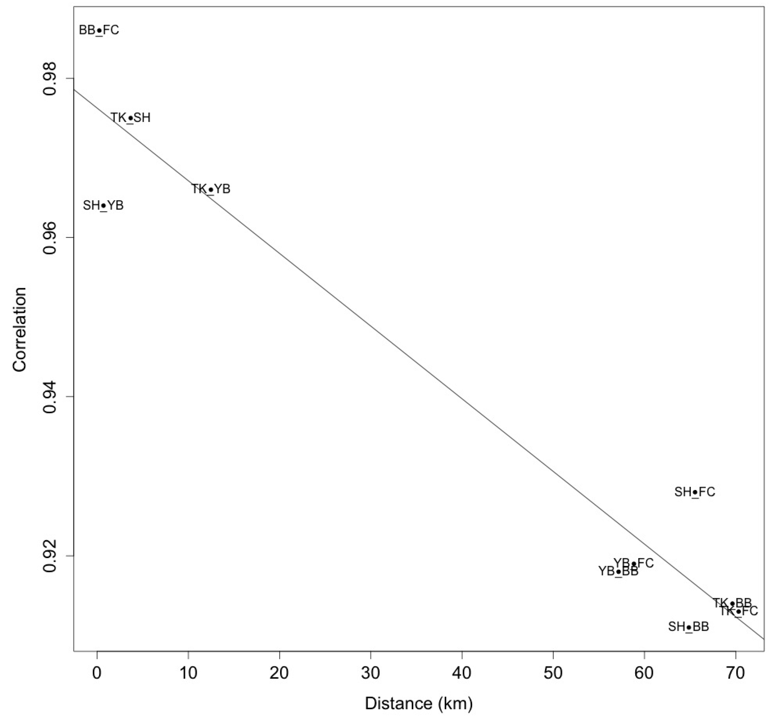 Relationship between the distance between study sites and logger temperature Pearson r correlation coefficient value. Closer study sites were more strongly correlated with each other than farther sites. The points are labeled with the abbreviation of each pair of study sites. Study sites shown are: Fogarty Creek (FC), Boiler Bay (BB), Strawberry Hill (SH), Tokatee Klootchman (TK), and Yachats Beach (YB). For example, SH_YB represents the relationship between the correlation strength of logger temperatures and the distance between Strawberry Hill and Yachats Beach.