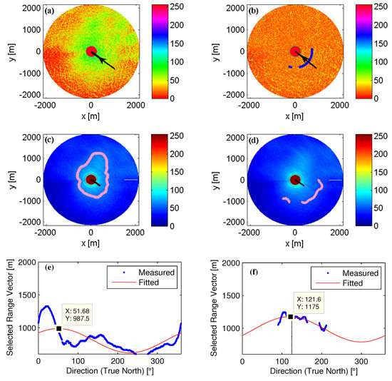 In the integrated image, for each predefined intensity level , the first range distance where the backscatter intensity is lower than is determined for each look direction. All the obtained range distances for are then stored as elements of the range distances vector . From these vectors, the one with the lowest —for which all elements are greater than the inner distance boundary (here 315 m)—is selected. After the first eight integrated images, only the last-selected and its two adjacent intensity levels and are used to obtain three corresponding range distances vectors. Of the three vectors, the one which meets the inner distance boundary condition and has the lowest intensity level is employed for wind direction retrieval, and is referred to as the retrieval range distances vector.