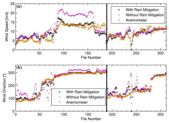 Data filtering incorporating the texture map as described in Section 3.1 was applied to the radar data before wind parameters were extracted using the modified ILS-based algorithm. The data collected during the second period (i.e., 28 November 11:16–28 November 12:06) were used as the training dataset to determine the wind speed calibration parameters in Equations (3) and (4), and the data obtained from the first period (i.e., 26 November 23:45–28 November 04:04) were employed for validation. These two datasets are separated with a vertical black line in Figure 4a,b. By utilizing the rain recognition technique proposed in [6], 9924 out of 49,182 images (i.e., 312 out of 1540 files) were identified as rain cases from the 4-day experiment data. In order to validate the rain-recognition algorithm, the precipitation data provided in the Non-Acoustic Data Acquisition System (NADAS) data file are depicted in Figure 4c. Since the difference between the precipitation data measured by the two gauges is large, the average value is used for qualitative analysis. It may be observed that the precipitation was nonzero for most of the period of the recognized rain cases. Here, only the images identified from the ZPP analysis as being rain contaminated are used to produce the wind results displayed in Figure 4. The comparison of the radar-derived wind velocities with and without rain mitigation is shown in Figure 4, in which the anemometer data are plotted as ground truth. It should be noted that the model (i.e., Equation (4)) obtained using the data recognized as rain cases with least-squares fitting was employed in the proposed wind algorithm. The error statistics for rain-contaminated, rain-free images, and the full dataset are shown in Table 2.