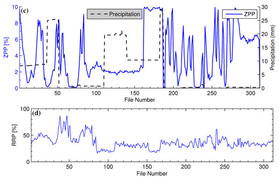 Due to the strong impact of rain on the number of pixels with zero intensity, the zero-pixel percentage (ZPP, i.e., the ratio, expressed as a percentage, of the number of image pixels with zero intensity to the overall number of pixels) was identified as a quality control parameter in determining the presence of rain [6]. In [6], those radar images contaminated by rain were discarded from the wind retrieval process. However, it was found that the influence of rain on different portions of the radar image may differ (see Figure 1d). The less-affected portions may still be useful for sea surface parameters extraction. In order to use this portion, the rain-contaminated portion in such an image should be recognized first.