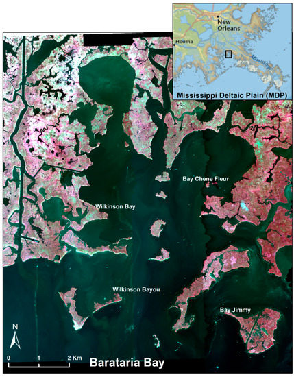 Figure 1 shows the location of Barataria Bay in the Gulf of Mexico along the Louisiana coastline. The bay is in an interlobe basin between the Bird’s Foot Delta and the abandoned Lafourche Delta lobes [42]. It is mainly saltmarsh habitat, as it is cutoff from fresh water or sediment input due to levees along the Mississippi River and the closure of Bayou Lafourche. The dominant vegetation in the low intertidal saltmarshes is Spartina alterniflora (saltmarsh cordgrass) and Juncus roemerianus (needlegrass rush), with subdominants Spartina patens (salt meadow cordgrass), Distichlis spicata (saltgrass) and Batis maritima (saltwort), which are more common in the higher marsh [43]. The DWH oil spill occurred offshore, about 160 km away from Barataria Bay. The oil came in with the tides primarily contaminating the seaward edges of these marshes, and the impact of oil in most areas extended approximately 15 m inland from the shore [31]. The impacted area next to the shoreline is mainly dominated by S. alterniflora and J. roemerianus [31]. The spill started on 20 April 2010 and continued until the well was capped on 15 July 2010. There were confirmed reports of oil in Barataria Bay by 7 July 2010 [44], and most of the oil had already arrived by August before our September image acquisition [39]. Hurricane Isaac made landfall on the Barataria Bay shoreline two years later on 29 August 2012.
