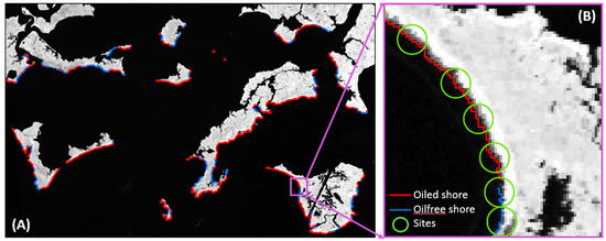 To avoid the bias, we generated sites randomly along the oiled and oil-free shore fragments at, on average, a 60-m distance from the centroid of any other site. This resulted in 644 total sites (oiled and oil-free) for 2010, 536 sites in common with 2010 for 2011 and 505 sites in common with both 2010 and 2011 for 2012 (Table 2). Since the DWH oil spill created a zone of dead vegetation, approximately 14 m to 17 m wide along the oiled shoreline [31], each site was buffered by a circle of 20 m in radius and included approximately 115 pixels (Figure 2B).