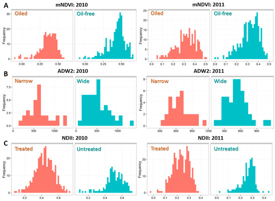 Histograms of index values from 2010 and 2011 shown to illustrate that the distributions were comparable across groups. Panels show index value histograms for (A) oiled and oil-free groups, (B) narrow and wide groups and (C) treated and untreated groups.