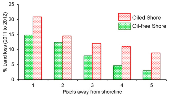 The analysis of oiled and oil-free shorelines by zone also confirms the disproportionate impact of the hurricane in oiled areas. While Hurricane Isaac caused shoreline erosion across the entire Barataria Bay in the first 14 to 17 m along the shore, in every zone (n pixels away from shore), the oiled shorelines lost more land than oil-free shorelines (Figure 4). In the first two pixels along the shore (0 to 7 m from the shore), oil-free shorelines lost 13.6% of their land; however, oiled shorelines lost 17.8% of land. Land loss decreased further inland from the shore. In the next two pixels along the shore (7 to 14 m from the shore), the oil-free shorelines lost only 6.3% of their land, while oiled shorelines lost 11.6% of their land (Figure 5).