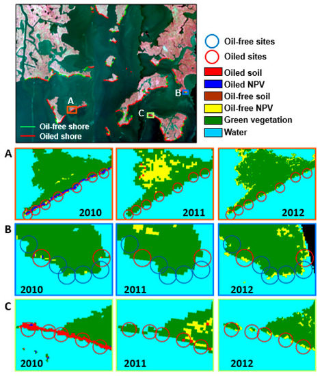 Color infrared imagery of Barataria Bay showing oiled and oil-free shores and the location of three insets, (A) moderately oiled island shoreline, (B) lightly oiled big island shoreline and (C) heavily oiled narrow land strip and island shore. The row images show classification results for all three years (2010, 2011 and 2012) for each inset and the distribution of oiled/oil-free sites within it. Severely oiled dead and dying vegetation pixels in 2010 show greening in 2011, but are vulnerable to loss after the hurricane in 2012. Panel (C) also shows the greater loss of vegetation in narrow sites relative to wide sites.