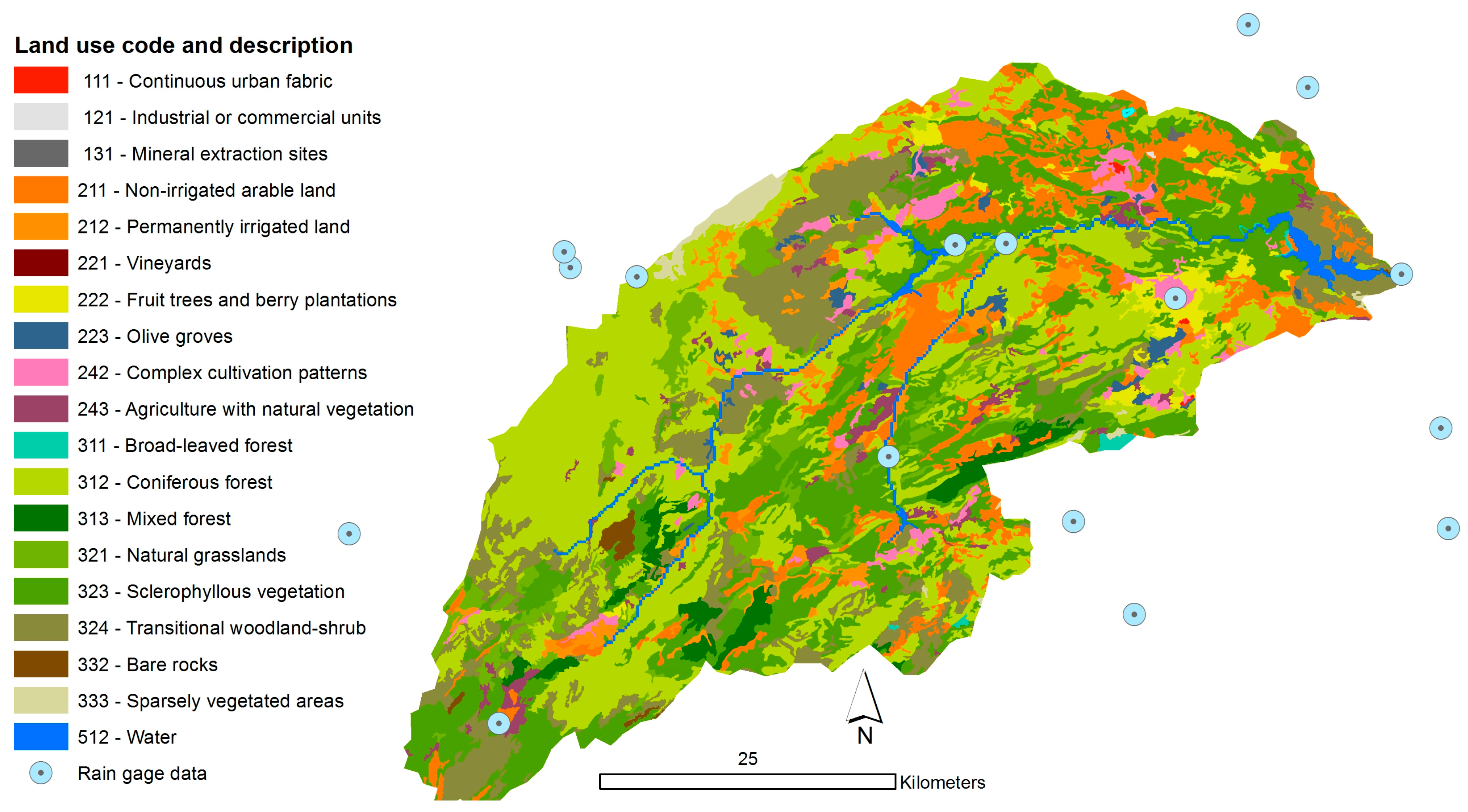 The dominant lithology consists of marls and limestones. Land use is rainfed farming (20%), forest (35%), shrubland and woodland (40%), and the remainder grasslands and sparsely vegetated areas (Figure 1).